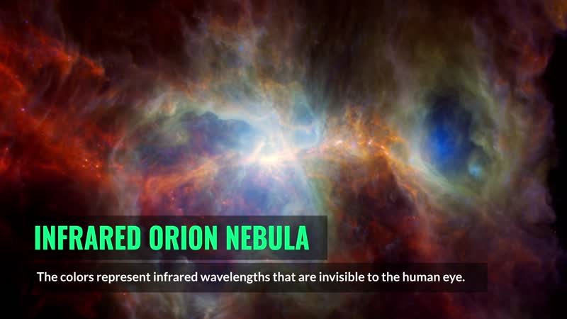 Enjoy a moment of Zen with this fly-through of the Orion Nebula, based on images captured by NASA and ESA (European Space Agency) telescopes The image shows infrared light, or wavelengths that the human eye cannot see. Stars radiate little or no light in these wavelengths, so the image shows only dust. The blue light indicates warm dust, heated by radiation from large, bright stars that can release up to one million times more light than our Sun. All that radiation breaks apart dust grains and carves out cavities, like the two blue “bubbles” in the image. Much of the remaining dust is then swept away by winds from the stars or when the stars die explosive deaths as supernovae. Around the edge of the two cavernous regions, the dust that appears green is slightly cooler. Red indicates cold dust that reaches temperatures of about minus 440 Fahrenheit (minus 260 Celsius). A cold ribbon of dust starts near the bottom right of the image and threads throughout the nebula. Red and orange filaments like these are where dust condenses and forms new stars. Over time, these filaments may produce new giant stars that will once again reshape the region. These images were captured by the now-retired Herschel Space Telescope, an ESA observatory, NASA’s retired Spitzer Space Telescope, and NASA’s Wide-Field Infrared Survey Explorer (WISE), which now operates under the moniker NEOWISE. Spitzer and WISE were both managed by NASA’s Jet Propulsion Laboratory, a division of Caltech, in Southern California. For more information about NASA’s Spitzer mission, go to: https://www.ipac.caltech.edu/project/spitzer For more information about WISE, go to: https://www.nasa.gov/mission_pages/WISE/main/index.html Credit: NASA/JPL-Caltech